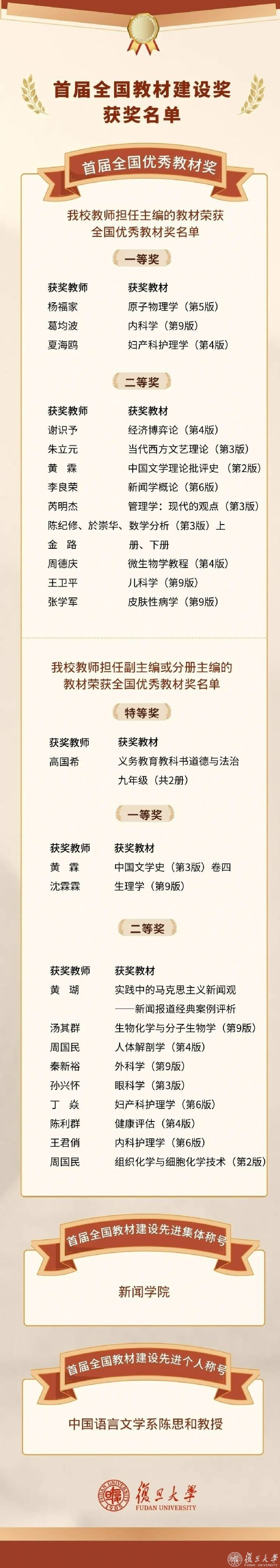 学校还启动首届复旦大学教材建设奖评选,评选出优秀教材奖特等奖22项,优秀教材奖一等奖33项、二等奖40项,此外还特设教材建设特别贡献奖、教材建设先进个人奖项。“七大系列精品教材”建设计划首批共立项51项,首批邀请了47位复旦著名教授主持编写校级重点教材,并通过认定制将3部教育部首批中国经济学教材和1教育部高校科技伦理教育专项教材认定为“七大系列精品教材”立项项目予以重点支持。