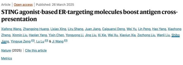 北京时间2025年3月27日0点,复旦大学基础医学院陆路、姜世勃团队联合中山大学附属第一医院王骥研究员团队、辽宁大学生命科学院曾颖玥副教授团队,在《自然》(Nature)杂志以Article形式在线发表了题为STING agonist-based ER targeting molecules boost antigen cross-presentation的研究论文。