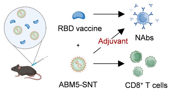 为了评估ABM5-SNT作为亚单位疫苗佐剂的应用潜力,研究团队使用Delta变异株的RBD与抗体Fc融合蛋白(RBD-Fc)与ABM5-SNT进行混合免疫。结果表明,单独使用RBD-Fc进行免疫接种,即使在免疫两针后也几乎不会诱导针对野生型RBD的抗原特异性IgG。然而,将RBD-Fc与ABM5-SNT联合使用后,免疫一针足以诱导高滴度的针对野生型病毒RBD的特异性IgG。同时,加入ABM5-SNT佐剂可将Delta变异株的RBD-Fc所激发的对野生型病毒的交叉中和抗体滴度提高10倍以上。在后续出现的Omicron BA.1和BA.5亚变体上,这一趋势仍然保留。