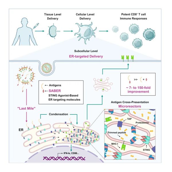 该研究开发了基于干扰素基因刺激蛋白(STING)激动剂的高亲和力内质网靶向分子(SABER),它能有效地将抗原在细胞内部递送至内质网,并通过折叠、重塑内质网膜使其聚集,形成包含膜相关蛋白酶体、STING相关抗原和抗原转运体的“微反应器”。此外,作者还通过肿瘤疫苗和传染病疫苗两种模型,证明了针对抗原交叉提呈细胞内从细胞质到内质网的“最后一公里”的精确靶向可以大幅提升疫苗免疫效果。