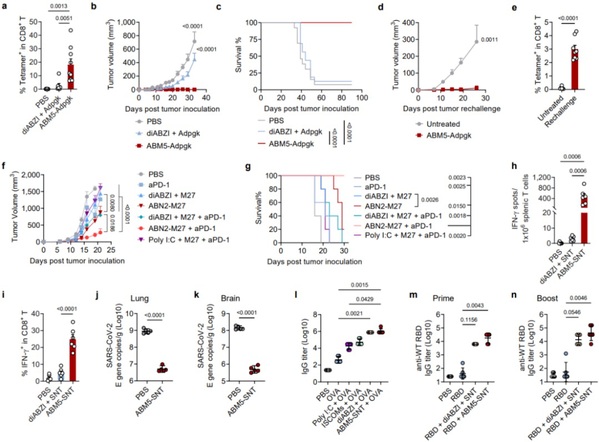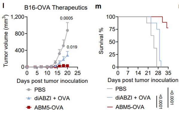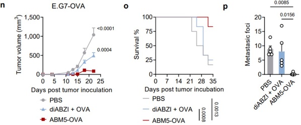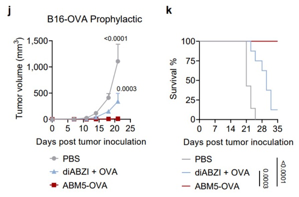 为了评估SABER疫苗设计增强的CD8+ T细胞应答在抗肿瘤免疫中的作用,作者从一系列对ABM5-OVA(羧基端偶联卵清蛋白(OVA)多肽的一种SABER分子)二次免疫后14天的小鼠进行表达OVA的黑色素瘤B16F10(B16-OVA)接种。结果表明,ABM5-OVA 疫苗接种显著抑制小鼠肿瘤生长,并且使所有小鼠免于死亡。接种对照佐剂疫苗diABZI+ OVA只能适度减缓肿瘤生长,并且约90%的小鼠在5周内死亡。除了疫苗的预防作用外,ABM5-OVA还可以在上述肿瘤模型中作为治疗性疫苗使用。相比于对照佐剂疫苗,它能够长时间(7周)抑制肿瘤生长。此外,研究团队还在表达OVA的恶性T细胞淋巴瘤E.G7-OVA上证明了该疫苗设计策略的有效性。