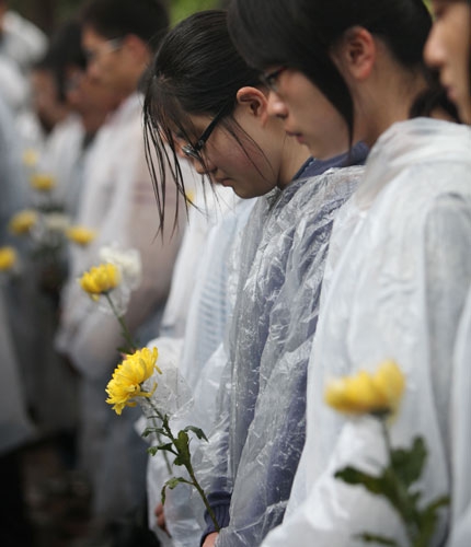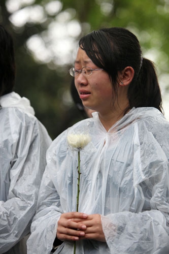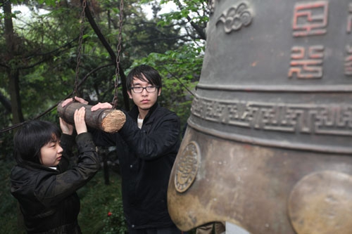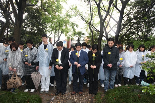 4月21日上午7点40分,60余名复旦师生陆续汇集到燕园世纪铜钟前,他们自发赶来这里,参加为玉树地震遇难同胞哀悼的鸣钟活动。7点49分,2名来自青海省的学生代表敲响了世纪钟,全场学生手持菊花,在沉重的钟声中肃立默哀三分钟,以此表达对玉树地震遇难同胞的哀悼。