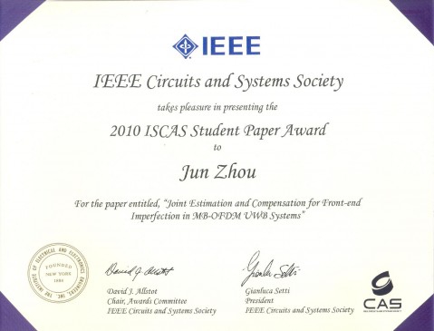 在学生论文竞赛中,专用集成电路与系统国家重点实验室2007级硕士研究生周军(指导老师任俊彦教授、叶凡讲师)的“Joint Estimation and Compensation for Frond-end Imperfection in MB-OFDM UWB Systems”分会场口头报告历经大会初评、决赛专场演讲、竞赛评委的现场提问,最终IEEE ISCAS2010授予周军的这篇论文以学生论文奖。这是大会4篇获奖的学生论文中唯一一篇由中国大陆高校研究生获奖的论文,也是中国大陆首次获得IEEE ISCAS学生论文奖。
