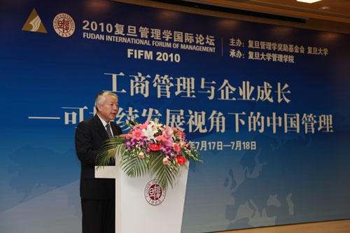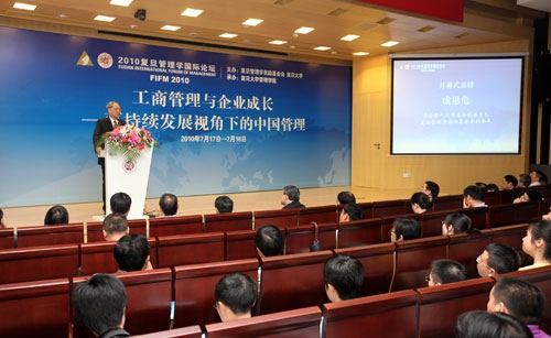 新闻中心讯 7月17日上午,2010年复旦管理学国际论坛在复旦大学正式开幕。来自海内外的百余位知名企业家、管理学家、政府官员济济一堂,总结改革开放30年来富有中国特色的管理理论与实践发展;共同探讨绿色环保、可持续发展主题下的中国企业的发展方向与模式。