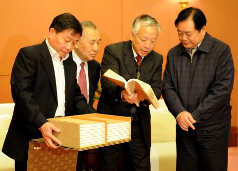 (秦绍德书记代表学校向蒋巨峰省长赠送精装版《红楼梦》全套)