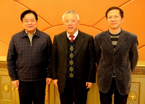 (蒋巨峰省长(左一)与秦绍德书记、李光宪会长(右一)合影)