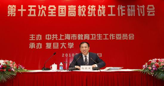 新闻中心讯 2010年11月3日,第十五次全国高校统战工作研讨会在复旦大学召开。中共上海市委常委、统战部部长杨晓渡、中央统战部六局局长王永庆出席开幕式并作重要讲话,国家教育部思想政治工作司司长杨振斌为研讨会作了《进一步提高高等学校统战工作科学化水平》主题报告,上海市教卫工作党委书记李宣海、复旦大学党委书记秦绍德在开幕式上致辞。来自全国各省(市区)党委统战部门、教育工作部门以及各地170所高校的250多位代表,围绕提高高校统战工作科学化水平开展了深入的研讨。上海市委统战部、上海市教卫工作党委有关负责同志出席了会议,中国统一战线理论研究会统战基础理论上海研究基地的专家为与会同志作了专题报告。