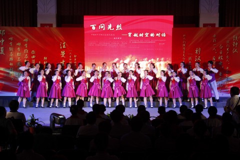 在上海教育系统庆祝建党90周年主题活动暨“百问先烈---穿越时空的对话”校园先烈寻访系列活动展演的现场,有着光荣的革命传统和深厚文化底蕴的复旦剧社通过一台校园剧的形式展示了上海教育系统在学习革命英烈和庆祝建党90周年系列活动中所形成的“七个一”成果:一组图文并茂的上海教育系统校园烈士事迹展览;一本讲述上海高校烈士故事的《上海高校英烈谱》;一本收录校园先烈名言、学生百问和学习感悟的《红色手记》;一套通过课堂讲课生动展现上海各校爱国主义教育基地的《红色一课》光盘;一册收集了上海各校爱国主义育人资源的《红色地图》;一次寻访上海校园先烈的“红色之行”;一台体现上海学习寻访校园先烈庆祝建党90周年的展演剧目。
