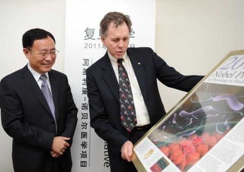 新闻中心讯 9月21日下午,阿斯利康诺贝尔医学项目中国巡讲在枫林校区明道楼一楼报告厅座无虚席,到处站满了听众,凡能容身之处均被挤得水泄不通,“诺贝尔奖之路-向幽门螺杆菌的发现者寻找启示”学术讲座在这里拉开帷幕,2005年诺贝尔生理或医学奖得主巴里•马歇尔教授生动幽默的演讲,受到超乎寻常的热烈欢迎。