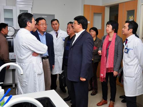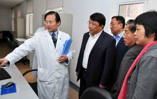 肿瘤医院院长郭小毛、党委书记李端树陪同第一组全体同志察看了医院实验研究中心、乳腺癌研究中心、小动物影像中心和院容院貌。