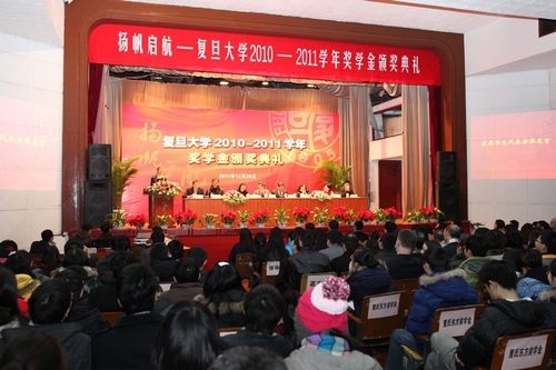 新闻中心讯 12月20日下午,“扬帆启航——复旦大学2010-2011学年奖学金颁奖典礼”在相辉堂举行。奖学金颁奖典礼是复旦大学一年一度的盛会,旨在褒奖品学兼优、全面发展的复旦学子,在全校营造一种鼓励勤奋、鼓励创新、鼓励攀登的文化,激励全校学生积极上进,不断超越。党委副书记陈立民、副校长冯晓源、对外联络与发展处处长张宏莲以及各国驻沪总领馆和设奖单位嘉宾等出席。各院系的九百余名中外获奖学生参加了颁奖典礼。