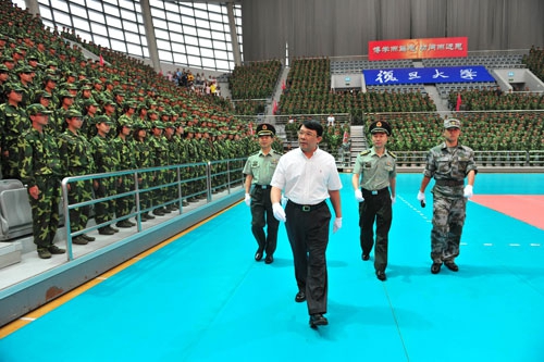 9月4日下午,我校2011级本科生军训汇报大会在正大体育馆隆重举行。上海警备区参谋长叶志胜少将、上海警备区副参谋长韩志凯大校、中国人民解放军七三〇三一部队参谋长封晓冰大校、杨浦区委常委、武装部部长李公债大校、杨浦区武装部政委郑玉良大校,以及校党委书记朱之文、副书记王小林、副校长蔡达峰、许征等出席本次汇报大会。大会由校党委副书记、军训团政委陈立民主持。