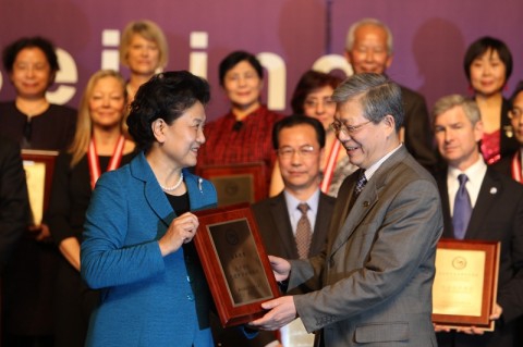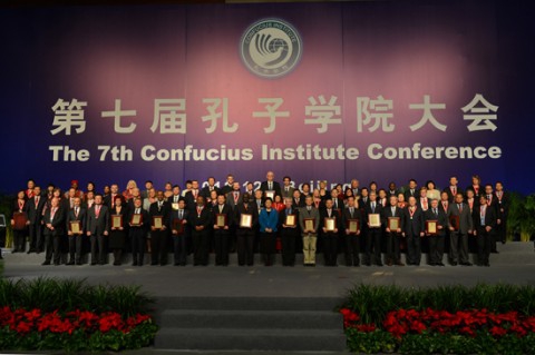 刘延东为全球孔子学院先进个人和先进单位颁奖。我校今年荣获国内先进孔院合作单位称号,杨玉良校长代表我校接过了奖牌。本次获奖,既是对我校六年来对于孔子学院的建设所做的工作和努力的肯定,也是对我校的鼓励和鞭策,激励我校再接再励,把孔院工作做得更好。