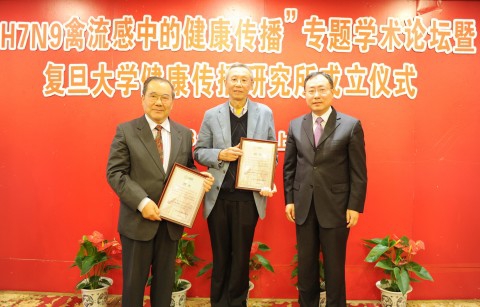 胡锦华、毛群安为复旦大学健康传播研究所成立揭牌。