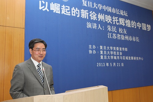 新闻中心讯 5月21日,时值校庆108周年之际,我校84届经济学院校友、江苏省徐州市委副书记、市长朱民回到母校,率团与母校签署合作协议,并登台复旦大学中国市长论坛,为师生们带来一场题为“以崛起的新徐州映托辉煌的中国梦”的精彩演讲。这是复旦大学建校108周年系列庆典活动中的一项重要活动,也是校友回馈母校,为母校诞辰带来的一份重要献礼。