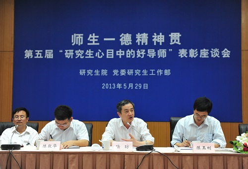 研究生院副院长陈玉刚主持座谈会,党委研究生工作部部长陈殷华汇报第五届“研究生心目中的好导师”评选过程和入选导师情况。“研究生心目中的好导师”评选活动由研究生团工委、研究生会在研究生院、党委研工部的指导下开展,两年一届,每届评出10位“好导师”,从2004年起已经连续举办5届。第五届评选活动从2012年11月启动,经过院系研究生推荐、全校宣传展示、网络投票等环节,于2013年1月下旬结束。中国语言文学系朱立元、新闻学院童兵、国际关系与公共事务学院陈明明、法学院郭建、生命科学学院马红、先进材料实验室郑耿峰、基础医学院程训佳、中山医院葛均波、华山医院张文宏、第五人民医院顾勇等10位导师获得“研究生心目中的好导师”称号,26位导师获提名奖。