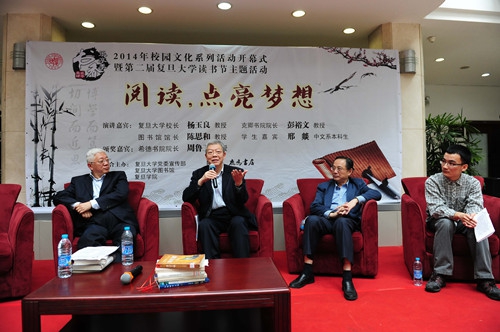 4月23日——“世界读书日”当天,2014年校园文化系列活动开幕式暨第二届复旦大学读书节主题活动在复旦大学图书馆举行。复旦学大学校长杨玉良、图书馆馆长陈思和、克卿书院院长彭裕文和读者代表邢燚同学围绕“阅读,点亮梦想”分别发表了演讲,向读者们分享了他们生活之中关于读书的点点滴滴以及他们的人生梦想。校党委副书记刘承功、校工会主席刘建中、希德书院院长周鲁卫等出席了活动。本次活动由校党委宣传部、校图书馆和复旦学院主办,鹿鸣书店协办。
