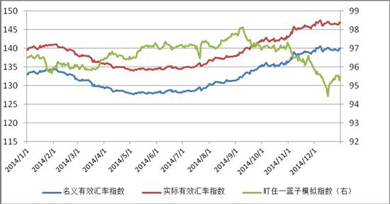 报告认为,2014年人民币有效汇率在上下半年分别呈现了不同的走势,上半年呈现高开低走态势,下半年则持续走高,直至年末趋于平稳,人民币有效汇率指数全年呈上涨态势。这主要是因为,人民币对美元即期汇率波动幅度扩大,但中间价仍然显著盯住美元,受美元持续走强拉动而导致人民币有效汇率大幅升值。我国经济形势复苏缓慢降低投资者信心,人民币贬值预期再次增强。同时,非美货币汇率波动共同推动了人民币有效汇率指数升高,本年度欧元、日元等发达经济体货币和卢布、巴西里亚尔等新兴经济体货币的贬值对人民币名义有效汇率指数的升值的贡献率最高。