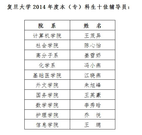 辅导员是帮助大学生健康成长的人生导师和知心朋友,也是学校宝贵的人才资源。复旦大学历来高度重视辅导员队伍建设,连续十一年举办“复旦大学本(专)科生十佳辅导员”评选活动,选树表彰了一批政治素质过硬、工作作风优良、深受学生爱戴的优秀辅导员,促进了队伍的交流和工作质量的提升,成为学校学生工作队伍建设的重要品牌。
