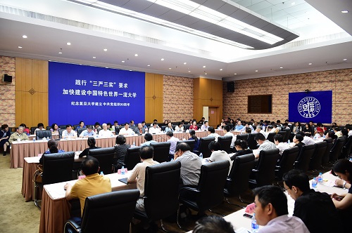 朱之文强调,面对新的历史使命和任务,我们要按照党要管党、从严治党的方针,紧紧围绕加快建设中国特色世界一流大学这一主题,全面加强学校党的思想、组织、作风、反腐倡廉和制度建设。重点抓好四方面工作:一是以中国特色社会主义教育为核心,着眼于用马克思主义中国化最新成果武装党员、教育师生,大力加强学校思想理论建设。二是以党支部建设为重点,大力加强基层党组织建设,充分发挥党组织和党员在教书育人、管理服务、服务病患、成长成才中的表率作用。三是以“三严三实”专题教育为抓手,大力加强干部队伍作风建设,筑牢思想根基,推动践行落实,完善长效机制。四是以落实“两个责任”为关键,强化纪律建设,加强监督管理,注重源头治理,大力加强党风廉政建设。