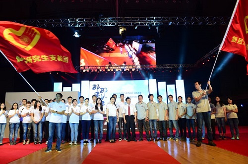 最后走上红毯的是2015年西部计划志愿者和第17批研究生支教团的成员,他们即将启程前往宁夏、新疆、贵州、西藏等地开展为期一年的志愿服务和支教工作。他们在毕业的红毯上接受了全场观众的致敬欢呼,从许宁生校长的手中接过了出征的队旗。随后,许宁生校长在汇集了手印的复旦墙上印染下“复旦大学校歌”几个字。此时,复旦墙上出现了发光的五线谱,手印在五线谱上逐个闪亮起来,连缀成跳动着的音符,奏出了校歌熟悉的旋律。这象征着每一位复旦人,都是复旦这所学校不可分割的一部分,所有人携手并肩站立,就能谱出最为华美的乐章。