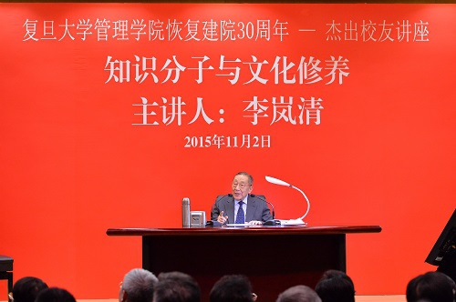 11月2日,原中共中央政治局常委、原国务院副总理、管理学院首届国际顾问委员会名誉主席、52届工商管理系校友李岚清同志应邀为我校师生做了一场主题为“知识分子与文化修养”的讲座。上海市委常委、市委秘书长尹弘,复旦大学党委书记朱之文,以及来自14所上海高校的党政领导和我校师生代表共300余人参加了讲座。朱之文书记主持了本场讲座。