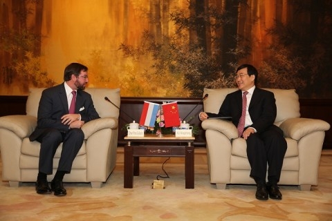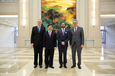 10月26日上午,卢森堡大公国大公储纪尧姆(H.R.H Crown Prince Guillaume of Luxembourg)、卢森堡财政大臣格拉美亚(H.E. Pierre Gramegna)、卢森堡大学校长Rainer Klump一行访问复旦大学,并出席复旦大学与卢森堡大学共建孔子学院的签约仪式。复旦大学校长许宁生,外事处、孔子学院办公室、发展研究院相关负责人参加会谈。