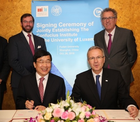 会谈结束后,在纪尧姆和格拉美亚的见证下,Rainer Klump与许宁生签署了卢森堡大学孔子学院合作协议及卢森堡大学与复旦大学合作建设孔子学院执行协议。出席签约仪式的还有卢森堡驻华大使石泰嵋(H.E. Paul Steinmetz)、卢森堡驻上海总领事吕可为(Luc Decker)以及卢森堡商贸代表团。