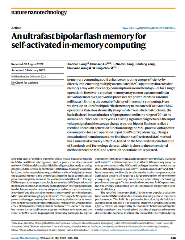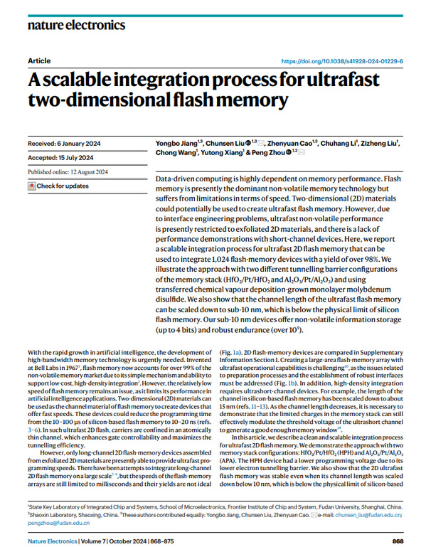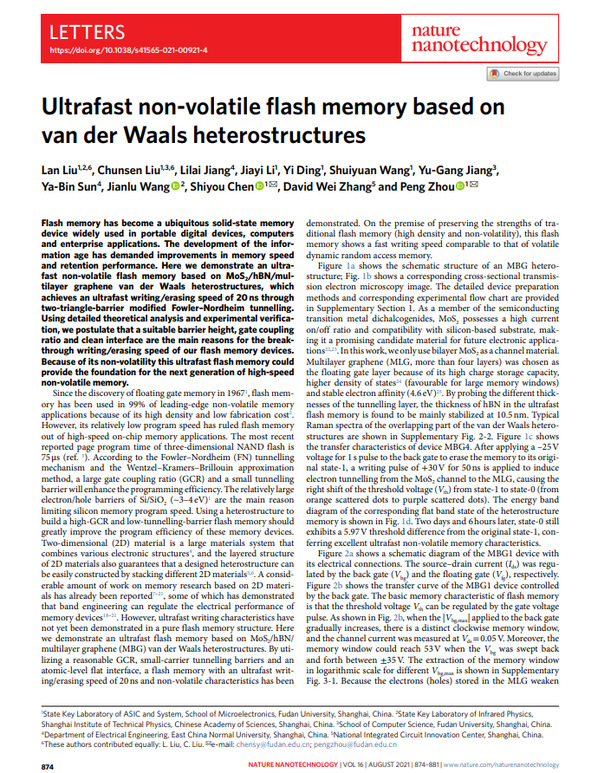 相关成果以《亚纳秒超注入闪存》(Subnanosecond flash memory enabled by 2D-enhanced hot-carrier injection)为题,于北京时间4月16日晚间在《自然》(Nature)期刊上发表