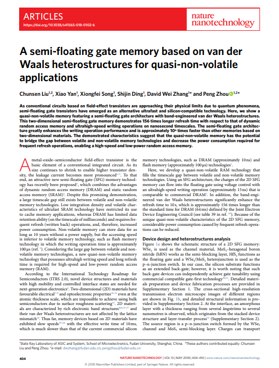 2018年,团队利用多重二维材料构建二维半浮栅闪存结构,将存取速度提升至10纳秒量级,这也是他们发表在纳米技术领域国际期刊Nature Nanotechnology上的第一篇闪存技术相关成果。不过,这项技术的器件结构仍较复杂,断电后,数据也只能保存十秒左右。