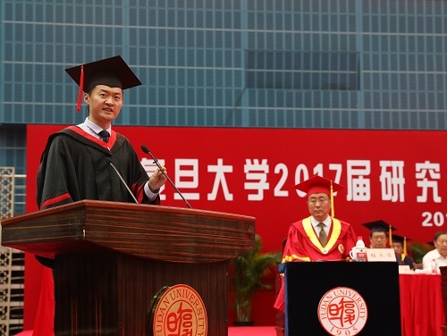作为复旦大学“学术之星”特等奖获得者,哲学学院陈岘博士代表毕业研究生发言。他说,他将永远铭记母校博学笃志的校训,“感谢复旦,为我们亮起了这一座灯塔。我们收获的不只是知识,还有思想和精神的传递。”