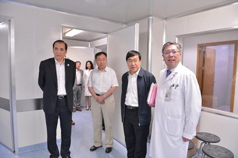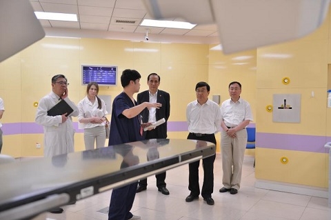 在陈建平的陪同下,许宁生一行先后参观了医院实验中心和供应室改造区域,并至住院部俯瞰了肿瘤医院东院项目的建设进展,最后实地考察了质子重离子治疗室的治疗演示和治疗椅的研发情况。
