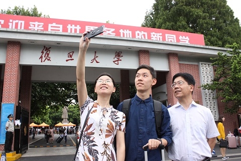 一家三口复旦人:复旦大学上海医学院新生陆以腾与父母在校门前合影留念。