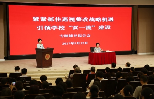 新闻中心讯 9月15日,教育部党组成员、中管高校巡视整改工作指导小组副组长王立英同志以《紧紧抓住巡视整改战略机遇,引领学校“双一流”建设》为题,为我校干部教师作深化巡视整改专题辅导报告。报告会由校党委书记焦扬主持。