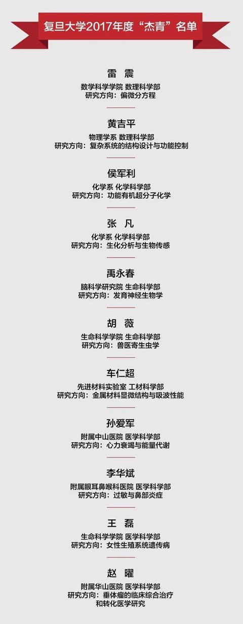日前,国家自然科学基金委公布了2017年度国家杰出青年科学基金(以下简称“杰青”)资助项目申请人名单,复旦大学共11人入选,创历史最佳成绩,仅次于北京大学和清华大学,居全国第三位。