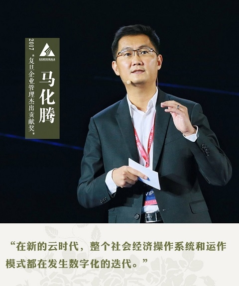 由来自学界、商界和社会团体的专家们共同推荐,经过评审委员会各级专家的评审,腾讯公司董事会主席兼首席执行官马化腾获颁“复旦企业管理杰出贡献奖”。他领导的腾讯公司把“连接一切”作为战略目标,提供社交平台、数字内容与金融服务等业务,满足互联网用户沟通、资讯、娱乐和金融等方面的需求,深刻地影响和改变了数以亿计网民的沟通方式和生活方式。在引领公司业务成长方面,他提出的“互联网+”战略和“去中心化”生态开放战略,推动了公司成为开放的平台型生态组织,带领千百万创业者与合作伙伴公司迅速成长,并帮助各行各业实现数字化转型升级。