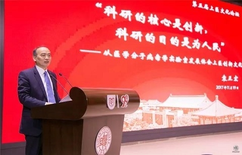 上医文化厚重而丰富。90年来,母校随着国家与时代的变化命运沉浮。颜福庆先生等先辈,为祖国强盛和国民健康创建上医,经过民国时期民不聊生的煎熬和抗日战火下的动荡迁徙,筚路蓝缕,艰苦卓绝,迎来了新中国阳光雨露下上医的新生和茁壮成长。上医的奠基人把他们的追求与梦想写进了上医校歌:“人生意义何在乎?为人群服务;服务价值何在乎?为人群减除痛苦。”校歌词句本真无华但却直指医学使命,这是他们为上医做的精神奠基。今天我们国家进入了建设中国特色社会主义强国的新时代,上医人身上承担着新的历史重任。后之视今亦由今之视昔,一代人有一代人的责任。所有上医人要高擎先辈点燃的精神火炬,继续为后人贡献自己,为上医增砖添瓦,把严谨厚实的文化一代一代传承下去。