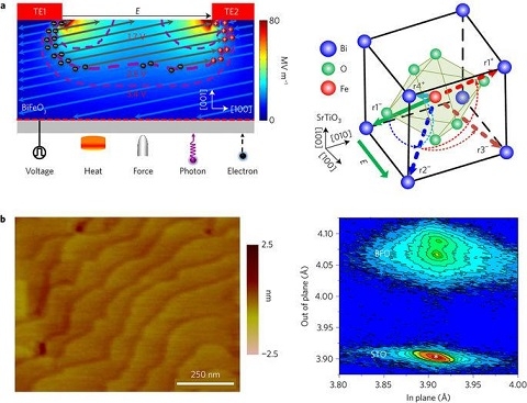 江安全课题组采用新型畴壁电流读出技术,在高度绝缘的铁酸铋薄膜表面创新性制备出三端纳米存储单元,通过控制存储单元的两个侧边电极实现电畴信息的快速写入,利用一个侧边和一个中间电极实现电畴信息的快速读出。当读电场与电畴写入方向平行时(“0”),读出电流低;反之,当读电场与电畴写入方向反平行时(“1”),存储单元表面的部分电畴会反转,从而与周边不反转的铁电畴形成了导电畴壁,读出电流高。以上高、低态读出电流开关比大于100,读操作过程中所形成的导电畴壁在读操作后全部自动消失,从而实现信息的非破坏性读出,并且减小了薄膜中长时间带电缺陷的运动或聚集影响所读出的畴壁电流大小,可靠性高。另外,存储单元尺寸越小,即存储密度越高,所读出畴壁电流越大,例如1 V读电压下7.2纳米尺寸的存储单元中能够读出的畴壁电流可达1微安,较目前国际上所报道的pA-nA量级的电流提高了1000倍,满足了存储电路的快速读取需求。最后,该存储器的平面存储密度能够超过目前市场所广泛使用的闪存,数据的擦写时间能够从毫秒量级缩短至纳秒,且能耗不及后者的千分之一,能够充分满足人们对快速通讯、大数据移动存储、低功耗物联网等不同应用场合的需求,预计会对现有半导体存储器的产业格局产生重大影响,为我国存储器产业的快速发展提供了机遇。