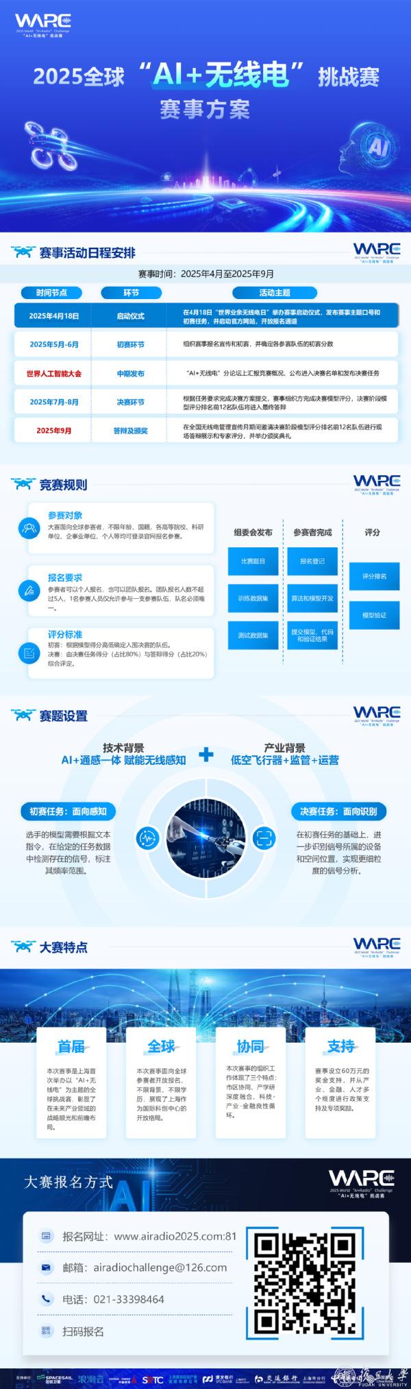 挑战赛通过互联网平台组织实施,在官方网站 www.airadio2025.com 公布赛题和数据集。参赛者在官方赛事系统上报名并提交参赛方案(模型)。全球任何感兴趣的团队或个人都可报名参与,推荐团队报名。