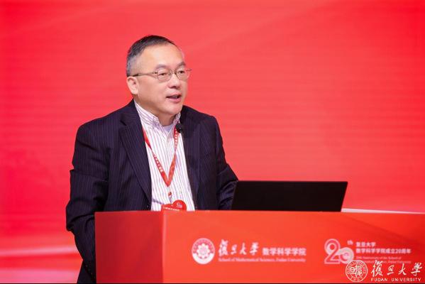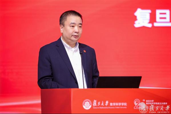 金力向数学科学学院全体师生员工、海内外校友表示热烈祝贺,并向长期以来关心、支持复旦数学学院发展的社会各界人士表示衷心感谢。他指出,数学是自然科学的基础,也是重大技术创新发展的根基。他充分肯定了数学学院过去20年来在立德树人、人才引育、科学研究和学科建设等方面取得的成就,表示复旦大学将继续全力支持数学学院,并对数学学院提出了三点期望:厚植拔尖创新沃土,在培养“干细胞式”拔尖创新人才上走在前列;聚焦国家重大战略需求,在打造数学创新策源地上奋勇争先;走高质量发展之路,在推进“三位一体”综合改革上打样示范。