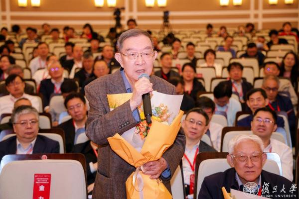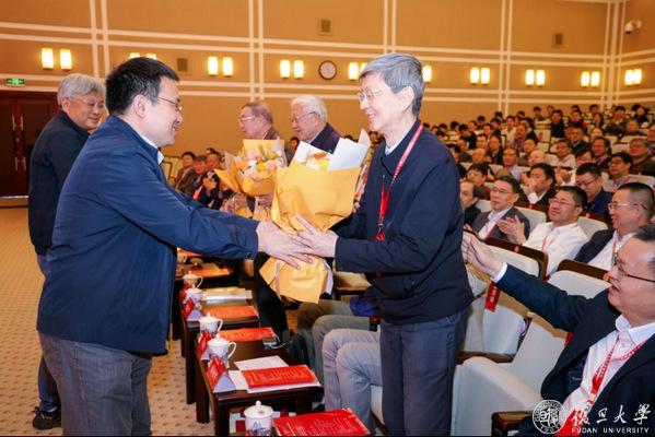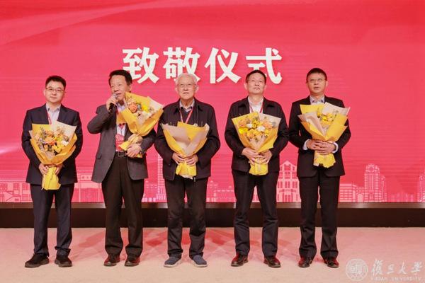 学院发展的每一个里程碑,都凝聚着历任院长的智慧与担当。洪家兴、吴泉水、郭坤宇、陈猛和雷震五位历任院长也来到台上,学生代表向他们献花致敬。五位历任院长发言时对数学界同仁、社会各界人士对复旦大学数学学科关心和支持表示感谢,衷心祝愿复旦数学学科不断进步,再造辉煌。