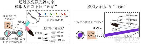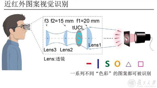 志愿者佩戴隐形眼镜后,通过纳米材料发出红、绿、蓝等三种可见波段的荧光,分别感知三种不可见的近红外光,也可以识别由不同波长近红外光组成的“复色光”,以及多组由不同波长近红外光组成的图案内容。这表明,具有抗干扰、正交发光和多光谱转换特性的多色稀土发光材料,可以有效地实现人类对近红外图像视觉。
