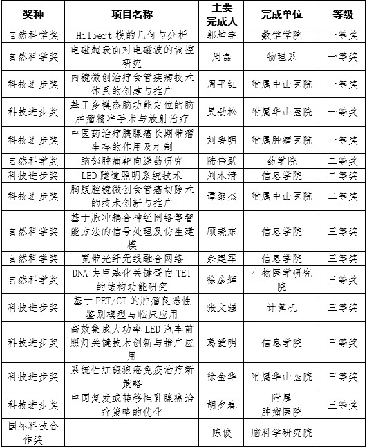 复旦大学数学学院教授郭坤宇领衔的“Hilbert模的几何与分析”、物理学系教授周磊领衔的“电磁超表面对电磁波的调控研究”等2个项目获上海市科学技术奖自然科学奖一等奖。附属中山医院周平红领衔的“内镜微创治疗食管疾病技术体系的创建与推广”、附属华山医院教授吴劲松领衔的“基于多模态脑功能定位的脑肿瘤精准手术与放射治疗”、附属肿瘤医院刘鲁明领衔的“中医药治疗胰腺癌长期带瘤生存的作用及机制”等3个项目荣获上海市科学技术奖科技进步奖一等奖。