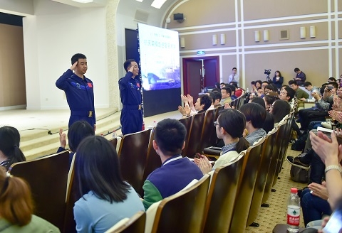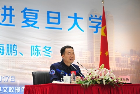4月17日,神舟十一号载人飞行任务乘组航天员景海鹏、陈冬走进复旦大学,与青年学生分享他们的飞天历程和航天梦想,受到学子热烈欢迎。这是神舟十一号飞船返回地球后,两位英雄航天员同时出席的第一场报告会。复旦大学党委书记焦扬出席英模报告会并致辞。