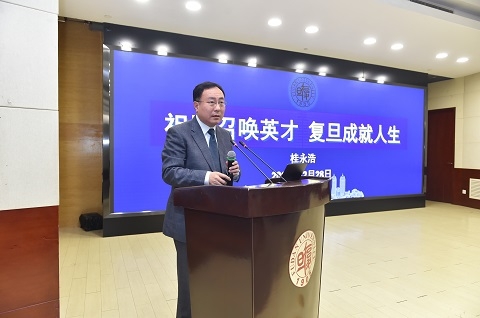 桂永浩作了主题报告,与大家分享了复旦的所来、所在和所求,重点介绍了学校的人才工作机制、人才发展体系,以及“卓越2025”人才计划的总体目标和具体内容,并指出,学校不断加大人才优先投入力度,改进人才支持方式,全方位提高引才竞争力,热诚期待与会青年才俊加盟复旦,成为学校建成世界一流大学的建设者和见证者。