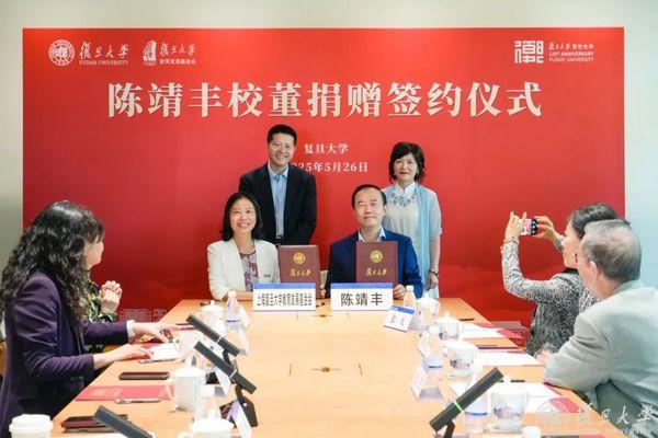 在复旦大学党委书记裘新、校友曹永玓的见证下,陈靖丰和复旦大学常务副校长许征签约。复旦大学党委副书记周虎主持签约。
