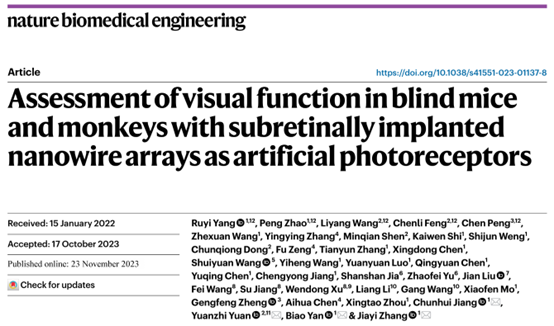 2023年11月23日,张嘉漪/颜彪团队在国际上首次报道利用纳米材料创新研发出新一代视网膜人工光感受器,成果发表于《自然·生物医学工程》(Nature Biomedical Engineering)。这一无源人工光感受器无需外部供电,仅凭光线即可自主工作,其空间分辨率和时间分辨率均达到国际领先水平,基于该人工光感受器目前已成功实施了四例临床患者手术。