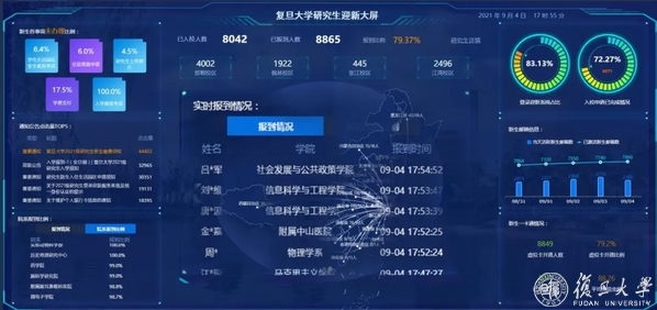 信息办制作了迎新大屏,可实时掌握新生报到情况。