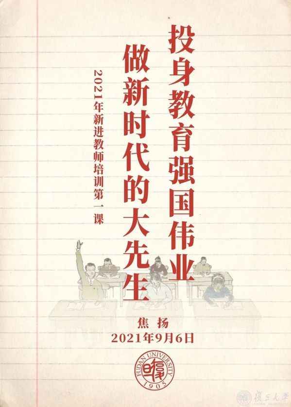 课堂最后,焦扬向大家送上教师节的祝福,并寄语复旦新教师们:坚定理想信念、弘扬高尚师德,发扬优良传统、传承红色基因,潜心立德树人、勇攀科学高峰,以赤诚之心、奉献之心、仁爱之心投身教育强国、创新强国事业,不断收获事业成就感、价值实现感、职业尊荣感和复旦认同感,在迈向第二个百年奋斗目标的新征程上共同谱写复旦腾飞发展新篇章!
