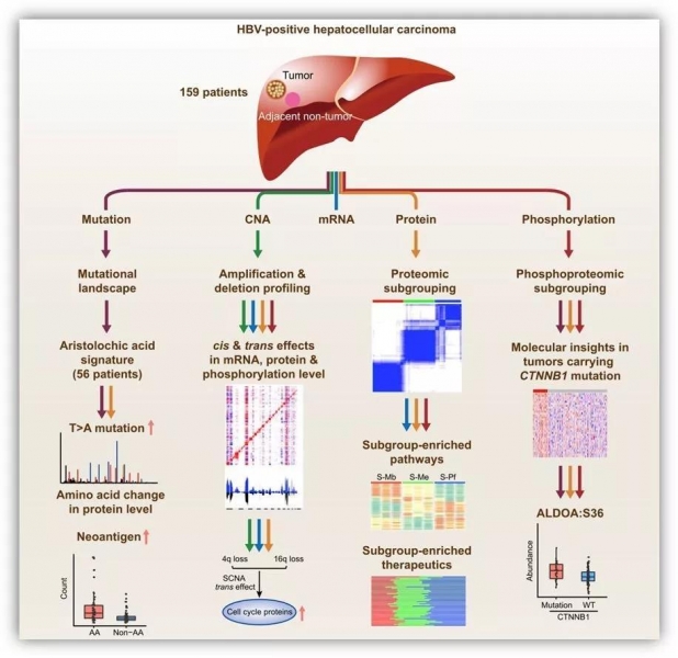 樊嘉院士等通过团队合作,利用159例手术切除的肝癌样本,全面检测和分析了基因突变谱、拷贝数变异、表达谱、蛋白质组及磷酸化蛋白质组,通过关联分析与生物学实验,全面解析了肝癌分子特征和发生发展的机制,揭示了我国肝癌突变谱与西方肝癌突变谱的不同之处,提示了基于中国人肝癌数据开展临床转化研究的必要性。